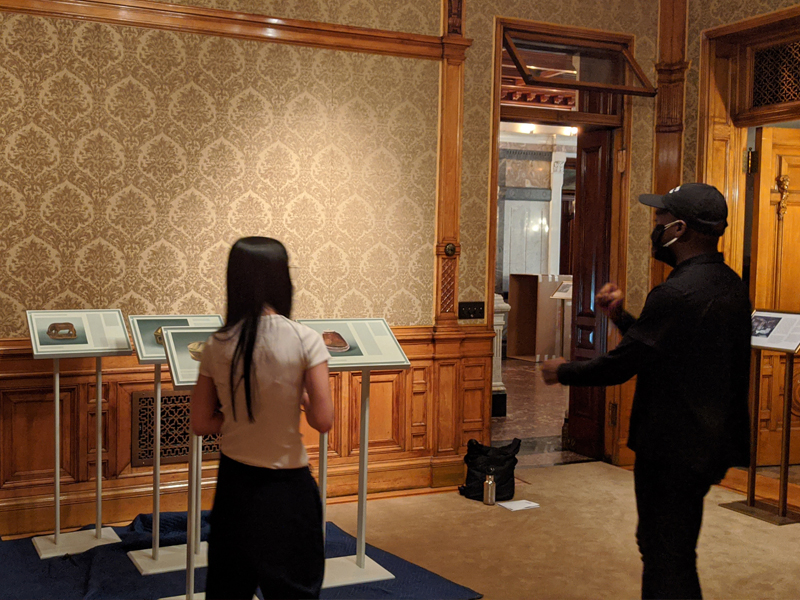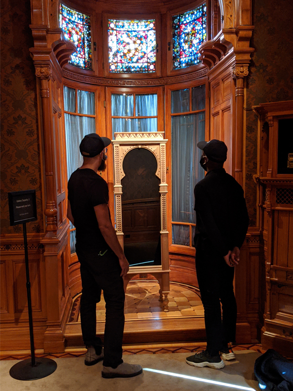Curator, Kekeli Sumah and artist, Nate Young viewing installation in the Sitting Room of The Richard H. Driehaus Museum, 2020.