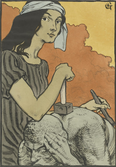 Why did Grasset produce these disturbing images? We do not know. However, he seems to have enjoyed a bit of fun at women’s expense in La Sculpture, a poster for an exhibition of work by the French sculptor Alexandre Falguière. For this occasion, he featured a confident young woman who wields a hammer and chisel upon the figure of a crouching man.