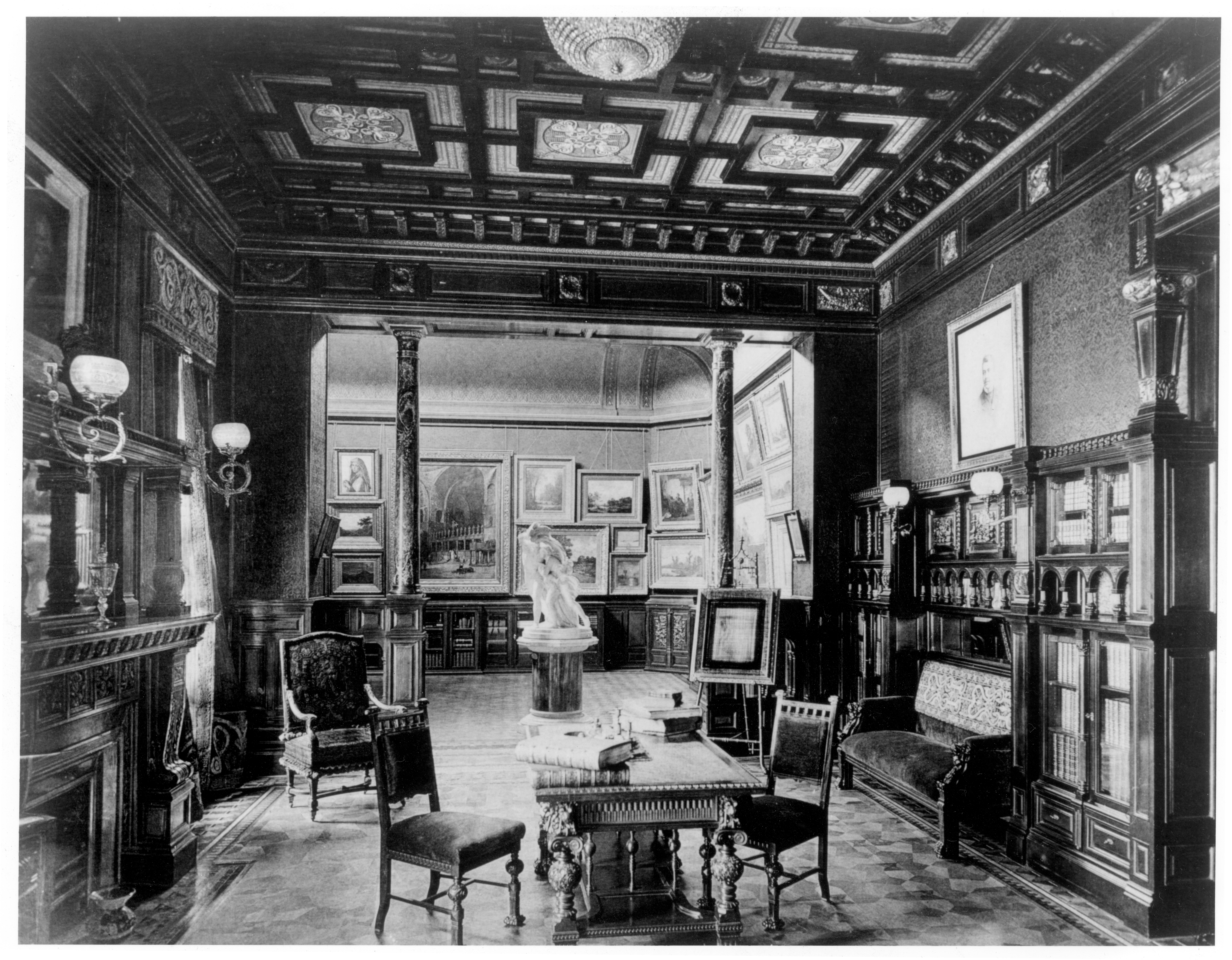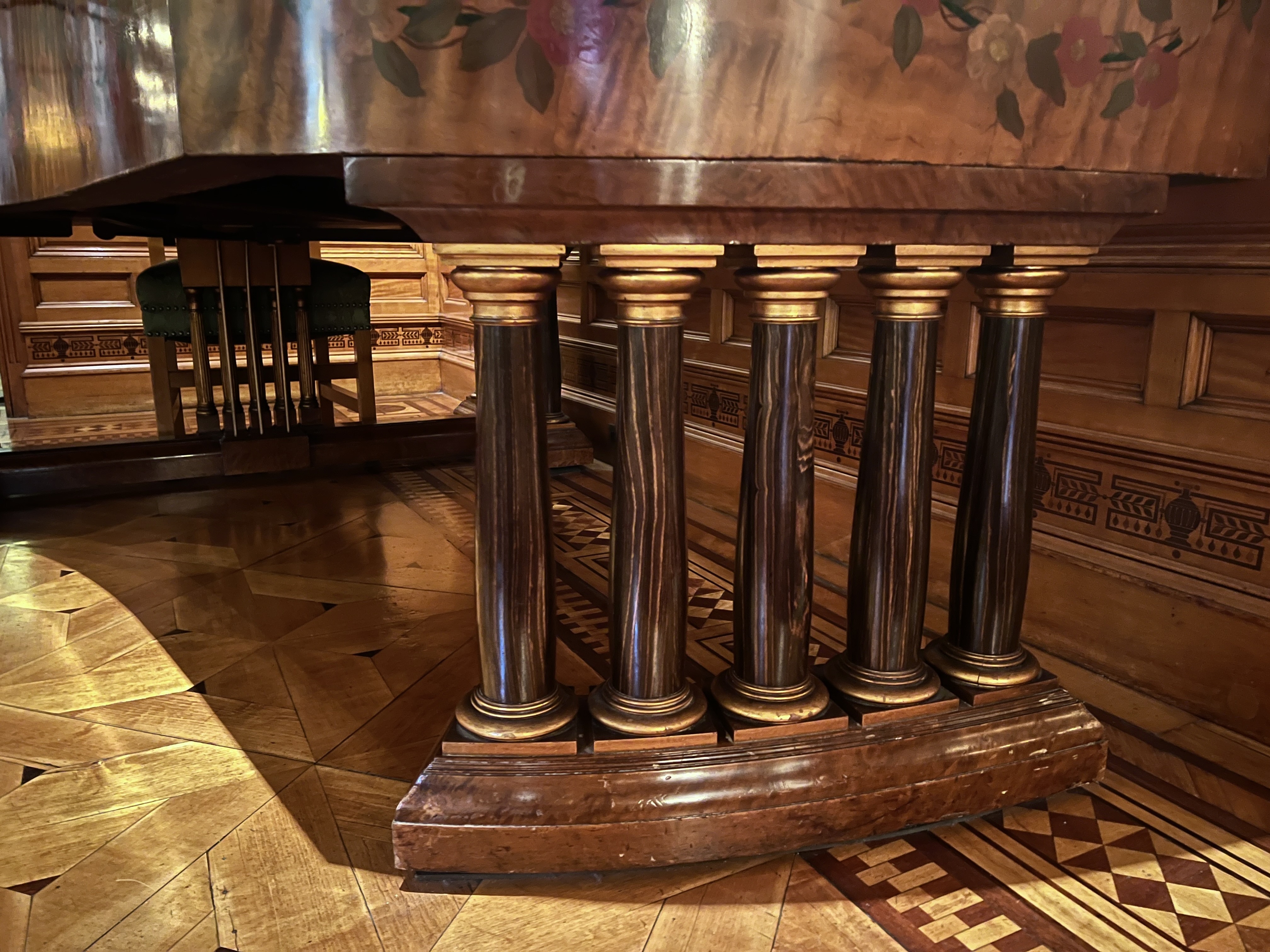 As the library is in a Renaissance revival style, it attempts to mimic the styles and aesthetics that were popular during the Renaissance period, when ebony was one of the most expensive and sought after woods in the world. The Renaissance overlaps heavily with the Age of Discovery – where Europeans explored, colonized, and conquered land worldwide. Because Europe now had colonies spanning the globe, the Renaissance gave wealthy Europeans access to building materials that they had never had before, including ebony, rosewood, and satinwood (which can be seen in the walls, furniture, and piano of the Nickerson Mansion’s Drawing Room) [3]. These exotic woods were incredibly costly due to the significant effort it took to source them. Additionally, because ebony is a very slow-growing tree, taking 70-100 years to reach a usable size, it will always be a limited resource [4]. This scarcity further increased the price of ebony and turned it into a status symbol, should someone have it in their house.