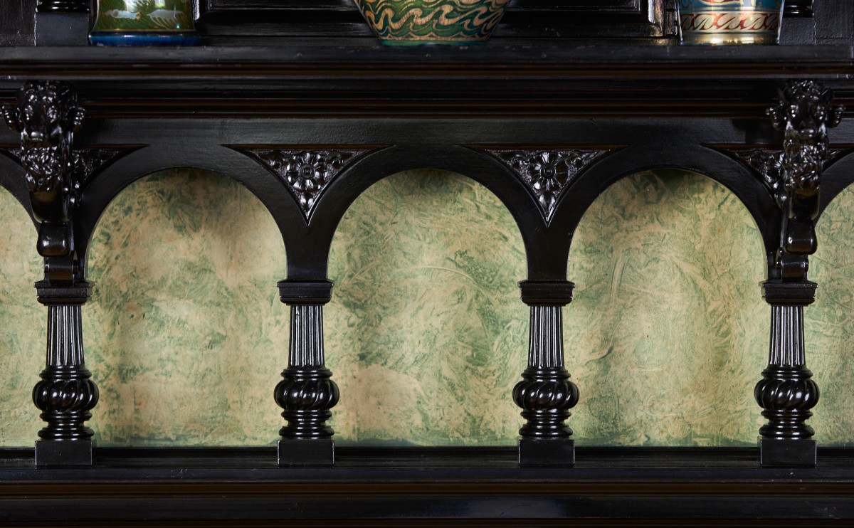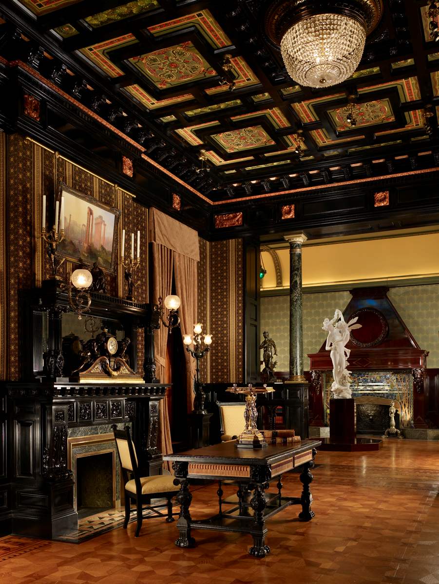 The imposing, black woodwork of the Driehaus Museum's Nickerson Mansion library is one of the most eye-catching elements of the entire home. While this woodwork is most prominently displayed on the walls, it can also be seen in the Victorian portfolio from the Museum’s collection and in the library’s original furniture suite designed by George A. Schastey. At first glance, this black wood may appear to be ebony. In reality, it is something else entirely: a man-made material called ebonized wood.