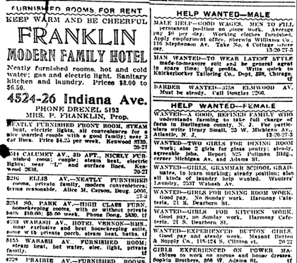 Between 1910 and 1920, in concert with increased need for labor due to the Great War, a successful effort led by Chicago’s Black community helped fuel the Great Migration. During this period, the percentage of African-Americans residing in Chicago increased by 148 percent.7 This was in large part due to a partnership between the Pullman porters and the Chicago Defender, a publication established by entrepreneur Robert S. Abbott in 1905 that served as advocate and support for what it called “the race.” The Defender opened a window to opportunities in the North for African-Americans while exposing their continued struggles in the South. Its classified ads offered jobs, housing, and transportation out of the Jim Crow South that no one else dared to. Southern towns dependent on cheap Black labor attempted to ban and regulate the distribution of the Defender. Distributors risked their lives to smuggle the paper into these towns and successfully circulated issues that made their way into common gathering places such as barbershops and churches to be read aloud in order to reach as many people as possible.8 Jobs advertised through the Defender ranged from restaurant staff to musicians to domestic services.9