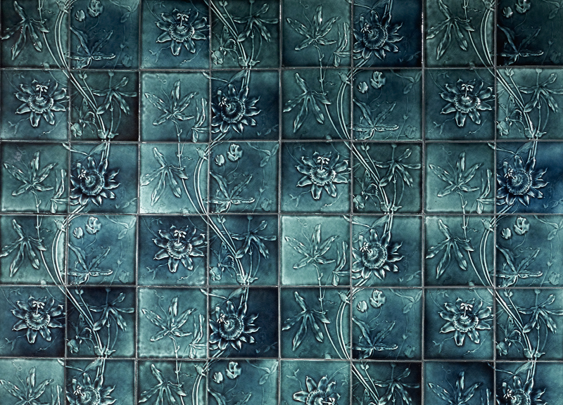 When the Nickersons commissioned their Chicago mansion, Low Art tiles were featured prominently throughout the interior decoration. Turquoise tiles in a repeating passionflower vine pattern cover the upper half of the walls in the Reception Room, the first room any guest would encounter before being admitted to the house. A more abstract design in a cool, light blue appears in the Moorish tiles on the Smoking Room walls; the same blue was used in the hearth of Mrs. Nickerson’s Bedroom.